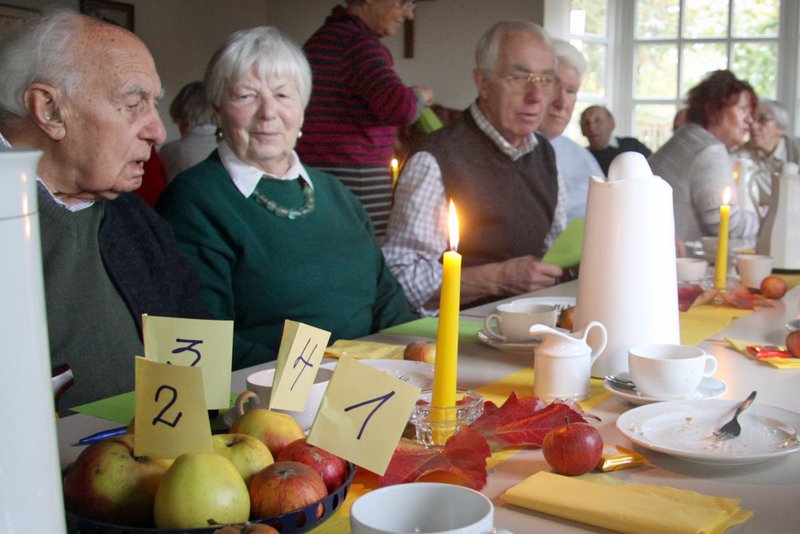Zu einem herbstlichen Nachmittag hatte der Diakonieausschuss der Kirchengemeinde Apelnstedt Seniorinnen und Senioren des Dorfes eingeladen. Die Einladung traf auf gute Resonanz, so dass sich über 30 Personen am vergangenen Dienstag, dem 6. November 2012, im Gemeindehaus der Kirchengemeinde versammelten. Renate Bartels, die Vorsitzende des Diakonieausschusses, berichtete bei ihrer Begrüßung von Schwierigkeiten, die sie beim Einkauf zu bewältigen hatte: leicht wäre es gewesen, für den Tischschmuck weihnachtliche Dekoration in allen Formen und Farben zu bekommen, problematisch hingegen war es, noch Herbstschmuck zu finden. Ein Quiz, bei dem verschiedene Apfelsorten zu bestimmen waren, sorgte für Unterhaltung. Vom Vorbereitungskreis selbstgebackene Kuchen und Torten wurden mit Applaus honoriert. Pfarrer Axel Heike-Gmelin las eine Geschichte der Erzählerin Elsa Lichtenfeld, ihr Resumee lautete: „Träume gehen in Erfüllung. Nur manchmal anders, als wir uns das vorstellen."